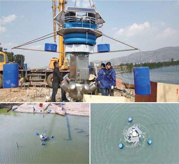 太阳能曝气机,以太阳能作为设备运转的直接动力,设置特别的旋切提拉曝气叶轮,通过叶轮旋转提升作用,将底部缺氧水转移到水体表面与表层富氧水混合。表层富含水通过离心旋转横向水平扩散、纵向进入底层缺氧区。由此实现水体解层、增氧和纵横向循环交换三重功效,更大限度地将表层超饱和溶解氧水转移到水体底层,增加底层水体溶解氧,消除自然分层,提高水体自净能力。